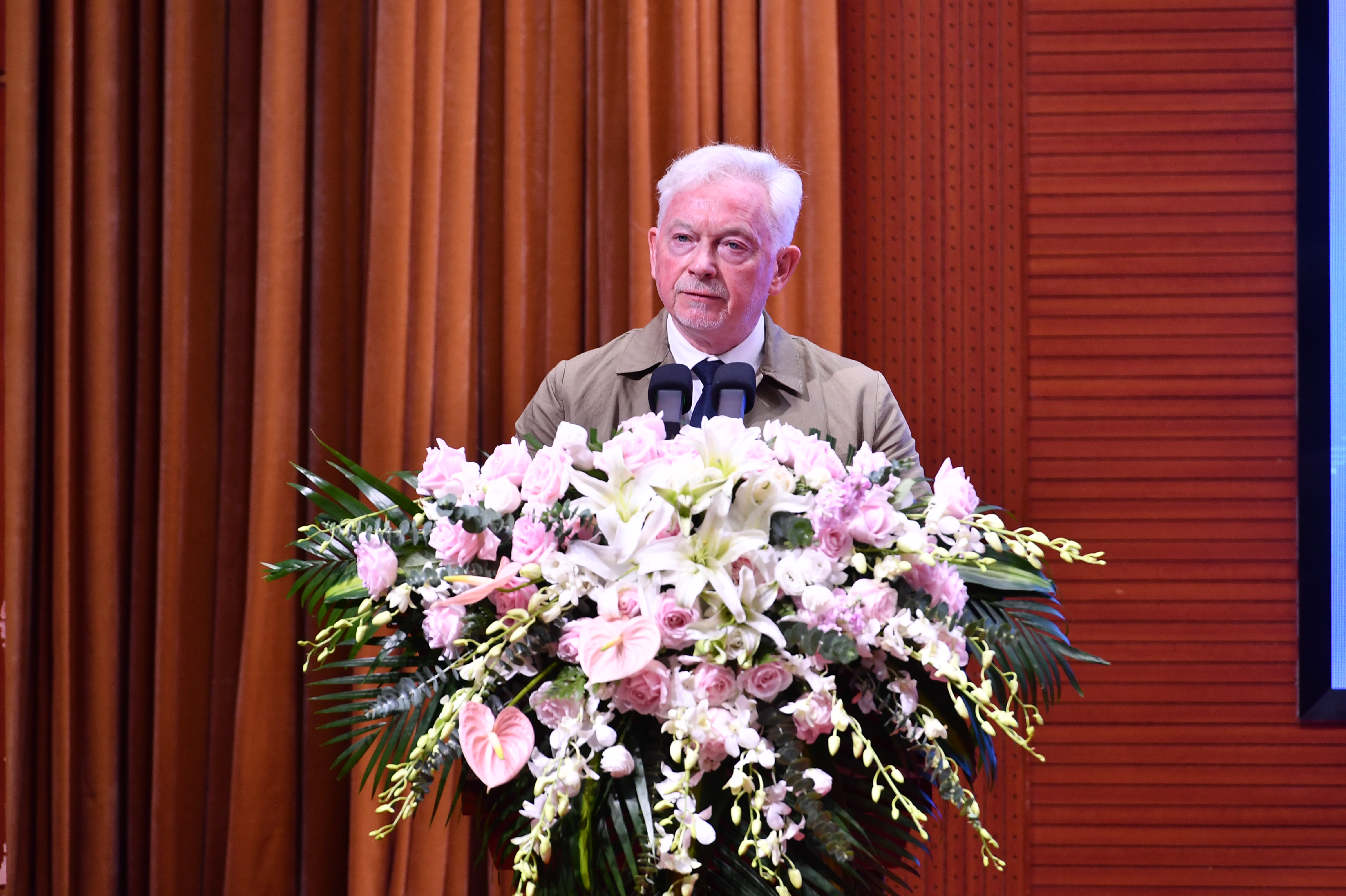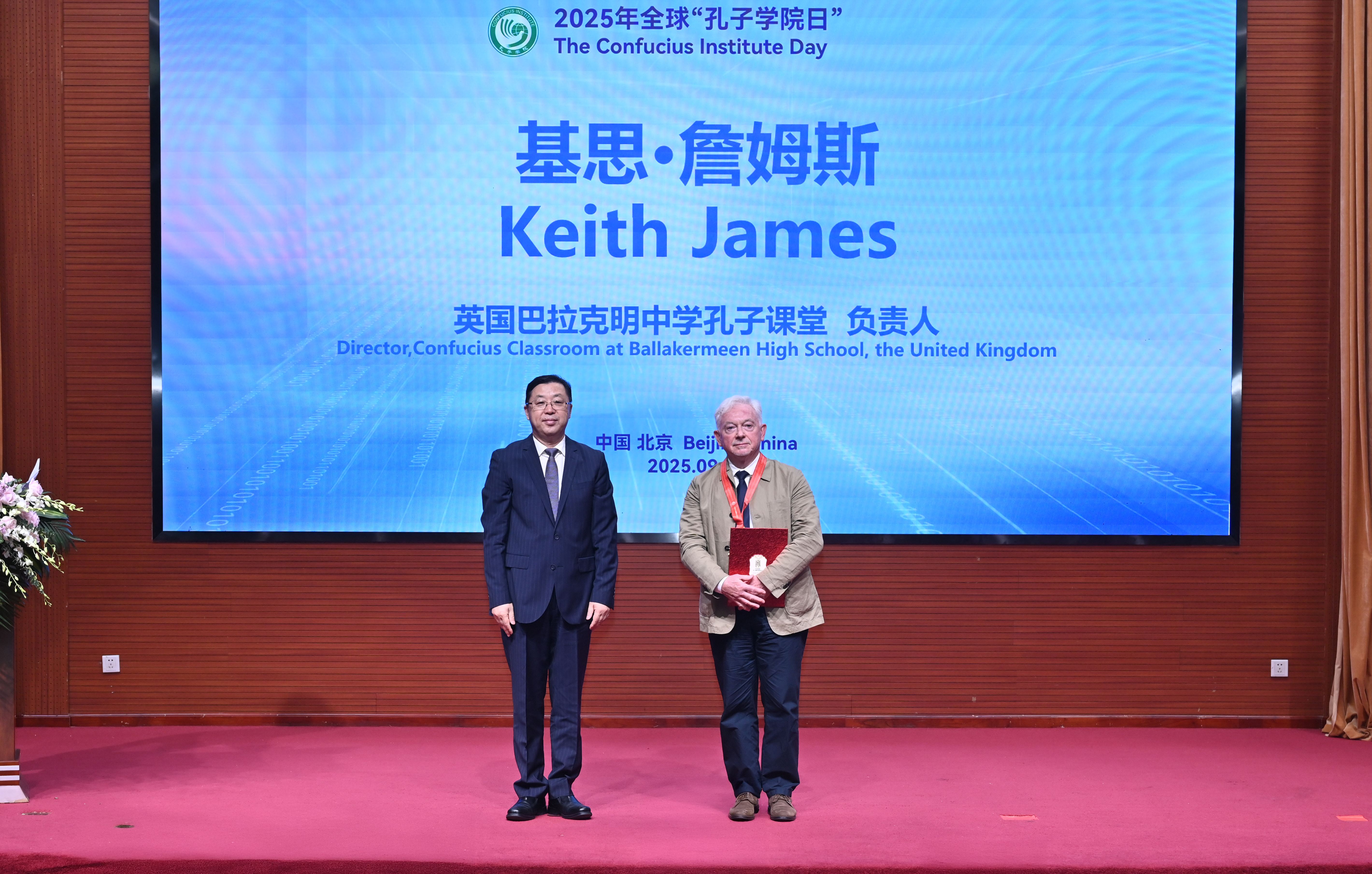 英国巴拉克明中学孔子课堂外方负责人、前副校长基思·詹姆斯代表孔子学院院长纪念奖章获得者发言,他分享了巴拉克明中学孔子课堂在数智教学方面的实践与成效,通过打造随时随地可访问的在线课程体系,持续优化数字化教学策略,孔子课堂的教学成果有了显著的提升。